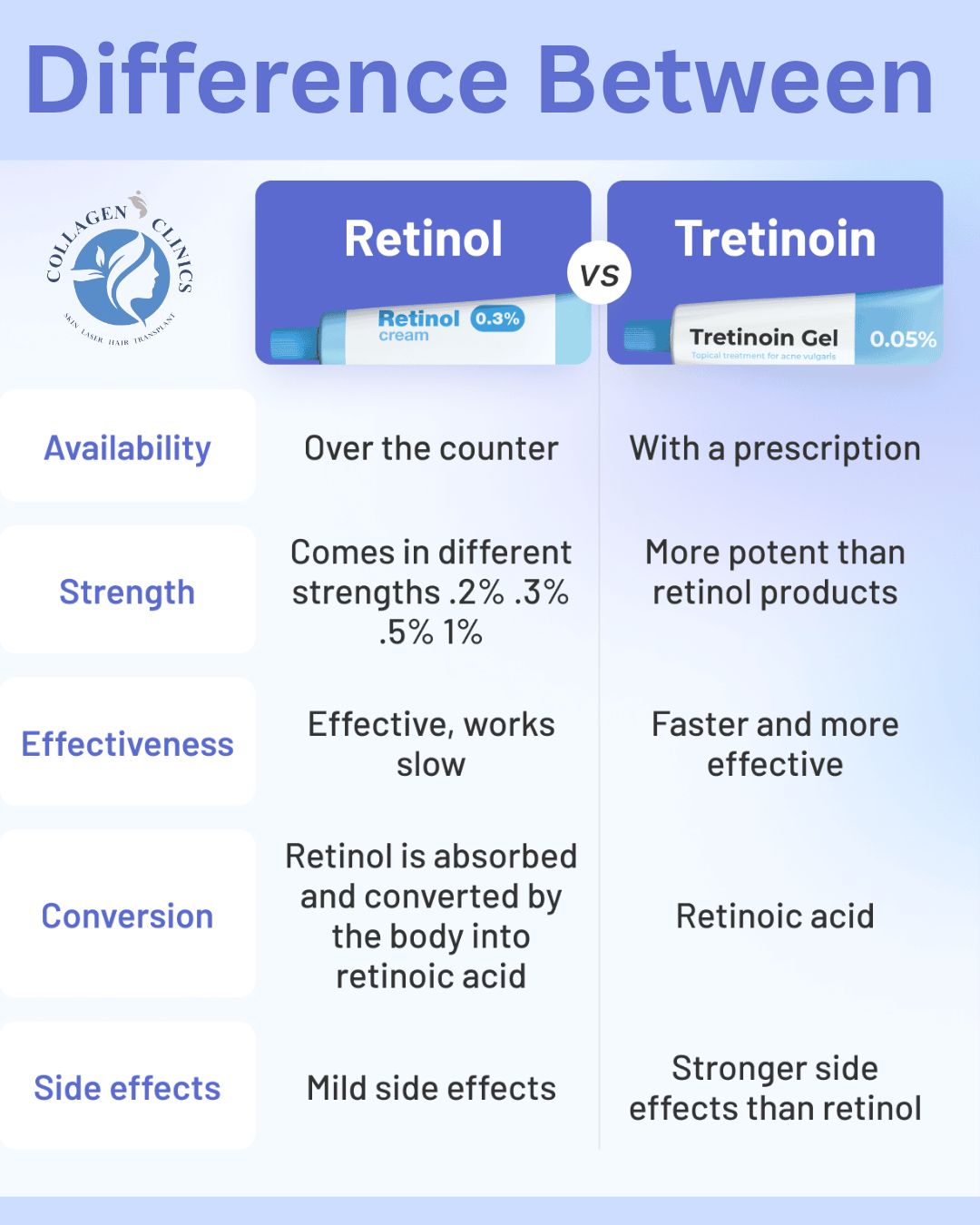 At Collagen Clinics, many patients start with Retinol and upgrade to Tretinoin gradually under supervision.