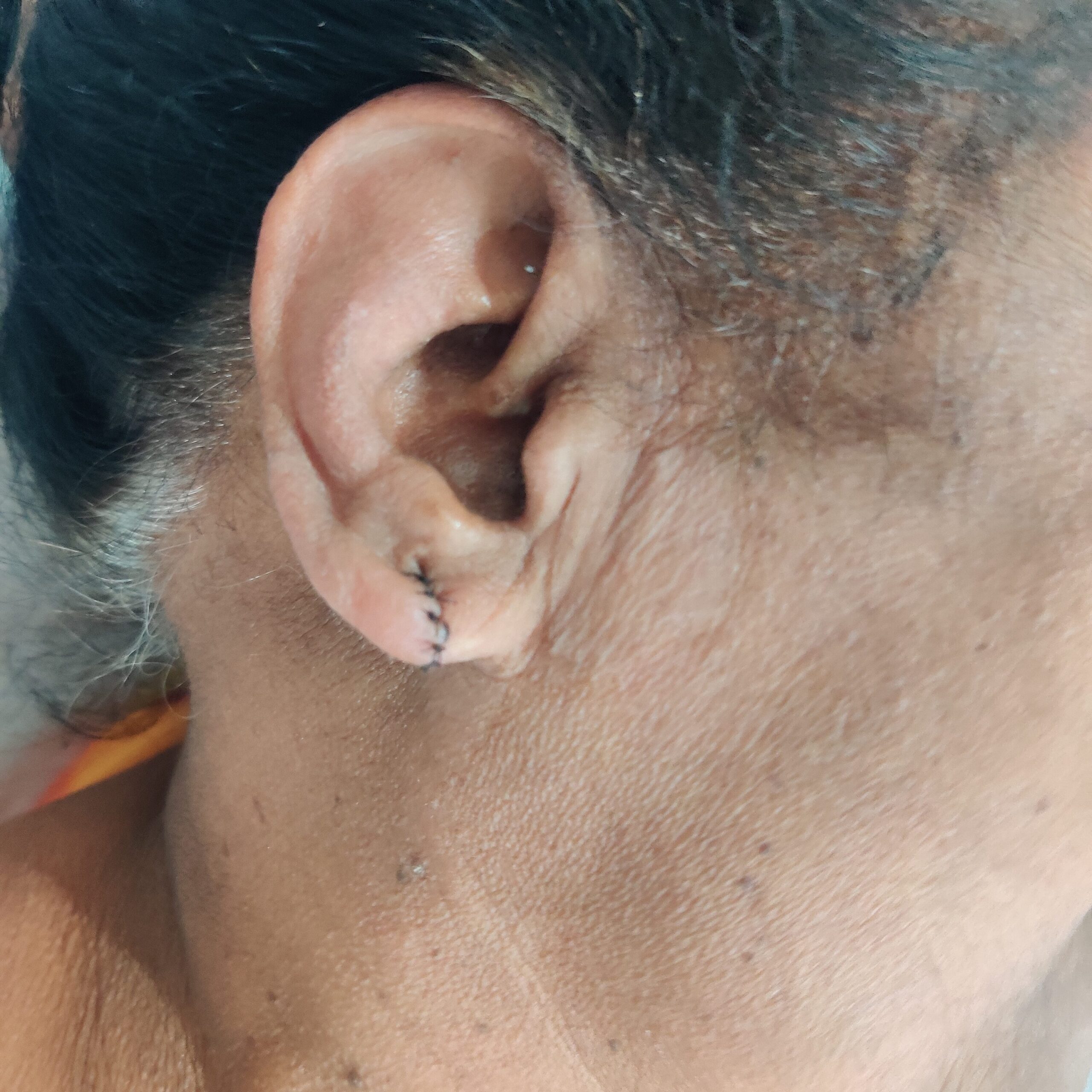 The fresh edges were realigned and sutured meticulously using fine, cosmetic sutures to maintain the ear’s natural curve and thickness.